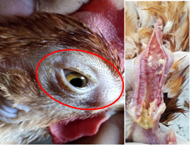 Figure 1. ILT Symptoms: swollen conjunctiva with foam, tracheitis (hemorrhage)